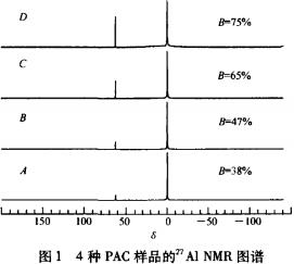 將實(shí)驗(yàn)室制備的4種聚合氯化鋁樣品全部稀釋為0.1 mol/L,用核磁共振儀進(jìn)行測試。采用德國Bruker公司的DSX-300型核磁共振儀,共振頻率為78.2 MHz.翻轉(zhuǎn)角為100.2次采樣時(shí)間間隔1s.以Al( H20)6+CI3為化學(xué)位移的參考定義6.0。